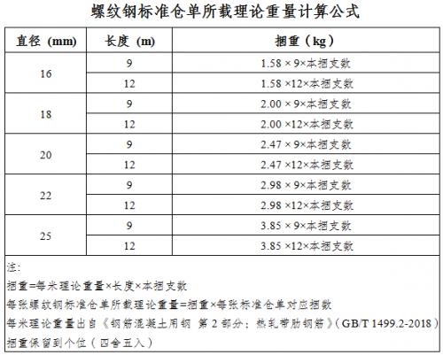 为保证各品牌螺纹钢标准仓单所载理论重量计算方式的规范性和统一性,根据《钢筋混凝土用钢第2部分:热轧带肋钢筋》(GB/T 1499.2-2018)中关于公称横截面面积与理论重量的相关规定,各品牌螺纹钢每张标准仓单所载理论重量由上海期货交易所标准仓单管理系统计算完成(计算公式见下表),各品牌螺纹钢相关规格的每捆支数和每张螺纹钢标准仓单所对应的捆数见我所公布的各螺纹钢注册企业信息。