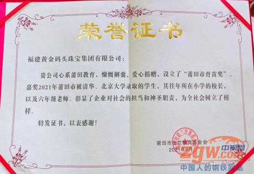 向福建黄金码头珠宝集团有限公司颁发爱心证书