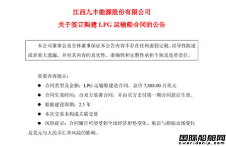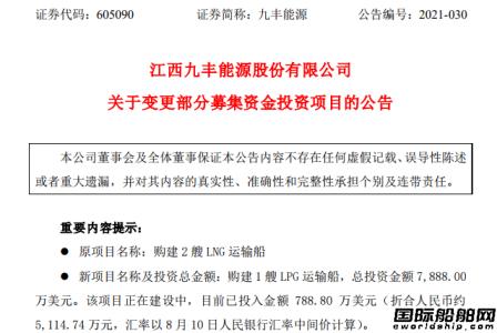 8月22日,江西九丰能源股份有限公司发布了关于变更部分募集资金投资项目的公告,拟终止“购建2艘LNG运输船”项目的其中一艘,变更募集资金约4.6亿元投入“购建1艘LPG运输船项目”。