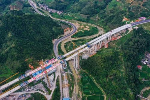 建设中的书洋特大桥(8月23日摄,无人机照片)。 8月24日,由中铁十六局集团承建漳(州)武(平)高速公路重难点及控制性工程——书洋特大桥主桥顺利合龙,该桥是全线首座合龙的大跨度桥梁。书洋特大桥采用双向四车道高速公路标准,设计时速100公里,全长1074米,主墩高86米。新华社发(许鹏健摄)