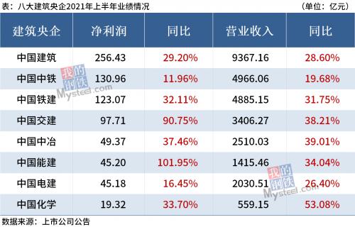 截止8月31日,八大建筑央企2021年上半年业绩报告已全部公布。数据显示,这八家企业均实现盈利,共计实现净利润767.24亿元,实现营业收入29139.78亿元。