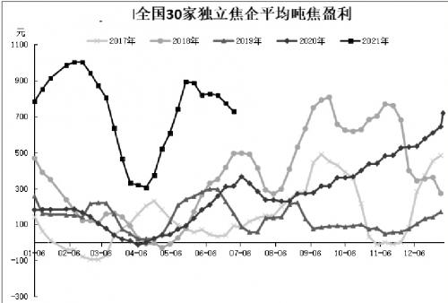 从焦炭基本面来看,上半年焦化行业盈利较为可观,平均吨焦盈利可达700元以上,属历史最高水平,去年全年吨焦盈利仅为270元左右。利润是企业的生存之本,在高利润的刺激下,焦企生产积极性必然提高,这也导致虽然2020年各地净淘汰落后产能超过2100万吨,但今年上半年焦炭产量仍出现大幅增长的情况。数据显示,上半年230家焦化厂剔除淘汰产能后的产能利用率平均值为88.45%,总体处于历史高位。在焦炭供应整体偏紧、库存压力不大的情况下,焦化厂仍有保护自身盈利不被过度挤压的能力。同时下半年仍是新产能的投放期,焦炭总体供应或继续稳步增加。