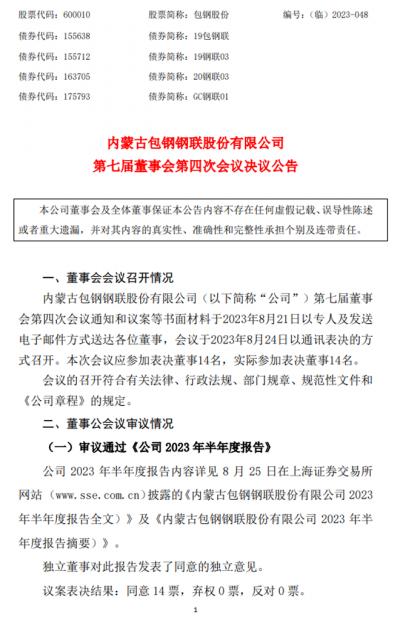 包钢股份: 包钢股份第七届董事会第四次会议决议公告