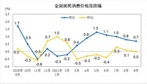 2021年9月份,全国居民消费价格同比上涨0.7%。其中,城市上涨0.8%,农村上涨0.2%;食品价格下降5.2%,非食品价格上涨2.0%;消费品价格上涨0.2%,服务价格上涨1.4%。1—9月平均,全国居民消费价格比去年同期上涨0.6%。