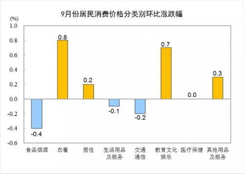 9月份,全国居民消费价格环比持平。其中,城市持平,农村上涨0.1%;食品价格下降0.7%,非食品价格上涨0.2%;消费品价格持平,服务价格上涨0.1%。