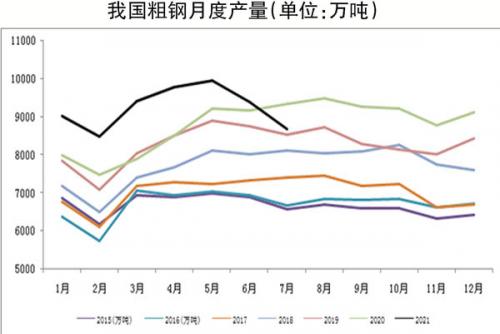 虽然前期市场心态被“稳价保供政策”扰动,担心压减产量政策的执行力度和效果,但是两个政策的实行和目标达成其实并不冲突,高层对于压减产量的态度也从未松懈,全年实现粗钢产量同比不增长的确定性很高。中国钢铁工业协会在近期召开的党委常委(扩大)会议上再次强调,要坚决执行“去产能回头看和压减粗钢产量”有关工作要求。中国宝武集团董事长陈德荣也提出:“坚决执行限产政策,这是政治问题,没有讨价还价的余地,必须坚决贯彻落实”。另外,继山东、江苏、山西等省份出台压减产量的具体措施或者整体框架后,近期河北省唐山市也出台《唐山市2022年北京冬奥会和冬残奥会空气质量保障实施方案》(征求意见稿),2021年河北省唐山市将压减粗钢产量1237万吨。另外,国家统计局公布的数据显示,2021年7月份,我国粗钢产量为8679万吨,同比下降8.4%,较6月份的粗钢产量9387.5万吨继续回落708万吨,已连续第2个月环比回落,且回落幅度由5.61%扩大至7.54%;全国粗钢日均产量为279.9万吨,环比下降10.5%。1月~7月份,我国粗钢产量为64933万吨,同比增长8.0%,较上半年的11.8%同比增幅回落3.8个百分点。