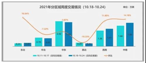 10月是二手车市场旺季,第三周日均交易6.41万辆,环比增长3.86%,与9月第三周相比增长1.4%。本周的交易量走高主要来自于南部地区的带动,中南西南等重点地区交易量均呈现两位数的增长。回顾10月前两周情况,第一周正值十一国庆期间市场重新被带回交易顶部,假日经济对于二手车市场带动作用明显,第二周日均交易6.16万辆,环比下降2.33%,黄金周的购车需求基本释放完毕,对于第二周集客和成交均带来一些影响,尤其是周后期,市场客流量开始下降,二手车经销商的到店率仅为前期的60%左右。本周虽又重回交易高峰,但自10月17日以来,本轮疫情在已波及全国11省份,主要集中在西北、华北等地。日前多地已经启动疫情防控三级响应,倡导非必要不出本省,目前部分涉疫地区的交易市场暂停营业,并且受疫情影响的地区还在扩大,这对10月第四周二手车市场将带来很多不确定性。