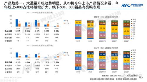 净水器今年线上线下大通量趋势均十分明显,根据奥维云网(AVC)线上监测数据,截止至2021年9月,线上净水器通量600G已经成为主要通量,占比达33.5%,而400G通量占比下滑至24.1%,800、1000G通量也有明显增幅。预计2021年底,600G通量占比进一步提升,超过35%。从新品数量及贡献率来看,大通量升级也是消费者选择的结果,400G今年新产品数量41款,与600G相差并不悬殊,但贡献率只有0.37%,消费者对400G产品青睐程度下滑,更倾向大通量产品,建议各个品牌方及时跟进,调整产品线。