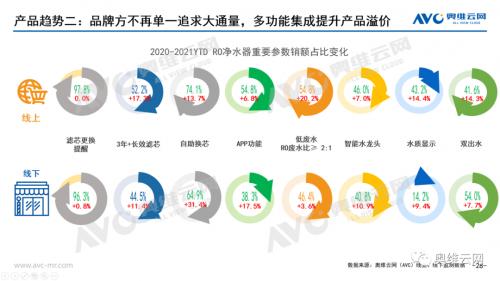 除了长效滤芯外,去年差异化比较明显的自主换芯、低废水、双出水等功能今年份额明显拉近,线上线下产品差异化在缩小。