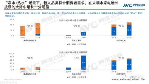 1、喝水需求升级:喝净水向喝不同温度水、喝健康水升级,这也是今年渠道方、品牌方大力推动的核心卖点,集成加热净水器、即热饮水机、台式净饮机线上及线下市场均取得了亮眼的增长成绩。21年9月,在小米集成加热产品带动下,集成加热净水器线上销额占比达到5.7%,线下一直由A.O.引领市场,今年份额一直维持在10%左右。在即热饮水机、台式净饮机免安装特质带动下,净水场景也摆脱了厨房水路限制,向卧室、客厅、办公室拓展。