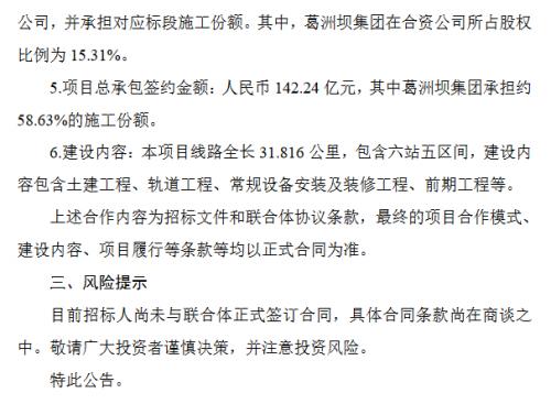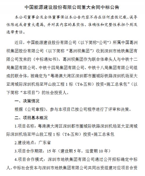 9月27日,中国能源建设股份有限公司发布重大合同中标公告,近日,其所属的中国葛洲坝集团股份有限公司(以下简称“葛洲坝集团”)收到深圳市地铁集团有限公司发来的《中标通知书》,被确定为“粤港澳大湾区深圳都市圈城际铁路深圳机场至大亚湾城际深圳机场至坪山段工程1标(T4-五和)投资+施工总承包”(以下简称“本项目”)的社会投资人。项目总承包签约金额为142.24亿元,其中葛洲坝集团承担约58.63%的施工份额。