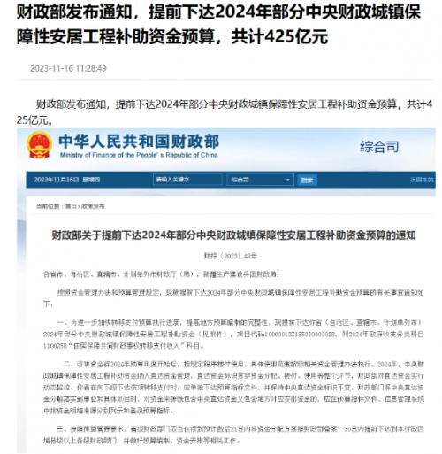 各省市、自治区、直辖市、计划单列市财政厅(局),新疆生产建设兵团财政局:按照资金管理办法和预算管理规定,现就提前下达2024年部分中央财政城镇保障性安居工程补助资金预算的有关事宜,提前下达2024年部分中央财政城镇保障性安居工程补助资金预算,共计425亿元。
