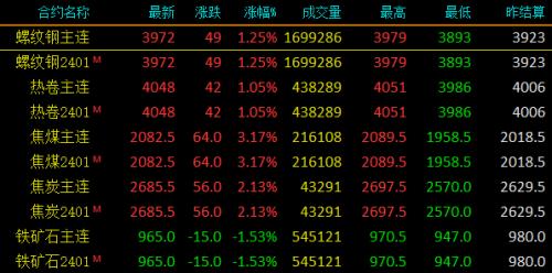 16日黑色系螺纹钢主力涨49,收报3972,涨幅1.25%;热卷主力涨42,收报4048,涨幅1.05%;焦煤主力涨64,收报2082.5,涨幅3.17%;焦炭主力涨56,收报2685.5,涨幅2.13%;铁矿石跌15,收报965,跌幅1.53%。