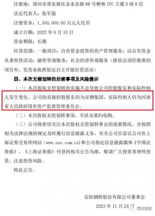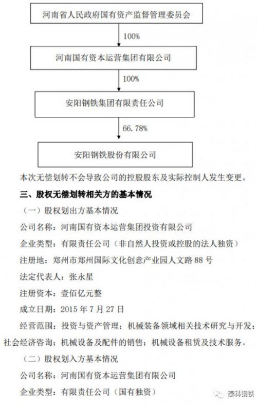 安阳钢铁11月24日公告,河南省国资委同意公司间接控股股东河南国有资本运营集团投资有限公司(以下简称“河南资本集团投资公司”)将所持公司控股股东安阳钢铁集团有限责任公司(以下简称“安钢集团”)100%股权无偿划转至河南国有资本运营集团有限公司(以下简称“河南资本集团”)。 河南资本集团投资公司与河南资本集团已签订《国有股权无偿划转协议》。本次股权无偿划转完成后,公司控股股东和实际控制人均未发生变化。 本次无偿划转完成后,河南资本集团未直接持有公司股票;通过其全资子公司、公司控股股东安钢集团持有公司人民币普通股股份1,918,308,486股,占公司股份总数的66.78%。 来源;泰科钢铁,版权归原作者所有,如有侵权,请联系删除