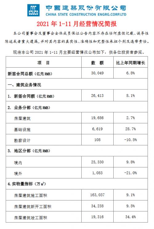 12月11日,中国建筑公布其1-11月主要经营情况,1-11月公司新签合同额30049亿元,同比增长6.8%。