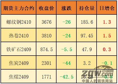 夜盘螺纹2410收3676,跌幅-0.70%,热卷2410收3810,跌幅-0.63%,铁矿石2409收874.5,跌幅-0.63%,焦炭2409收2301,跌幅-1.88%,焦煤2409收1771,跌幅-2.34%。