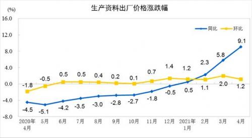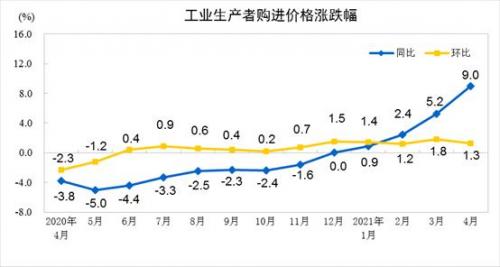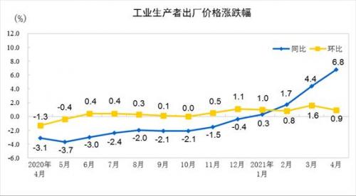 2021年4月份,全国工业生产者出厂价格同比上涨6.8%,环比上涨0.9%;工业生产者购进价格同比上涨9.0%,环比上涨1.3%。1—4月平均,工业生产者出厂价格比去年同期上涨3.3%,工业生产者购进价格上涨4.3%。