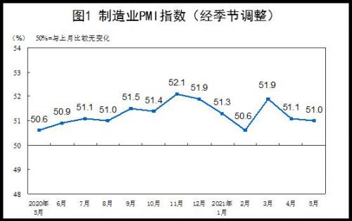 5月份,中国制造业采购经理指数(PMI)为51.0%,微低于上月0.1个百分点,继续位于临界点以上,制造业保持平稳扩张。