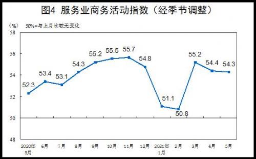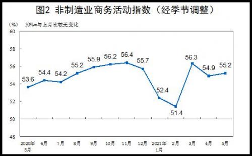 5月份,非制造业商务活动指数为55.2%,较上月上升0.3个百分点,非制造业扩张步伐有所加快。