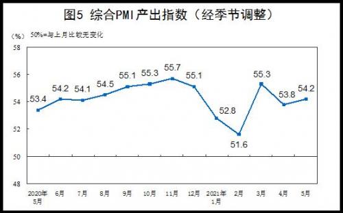 5月份,综合PMI产出指数为54.2%,比上月上升0.4个百分点,表明我国企业生产经营活动总体延续稳步扩张态势。