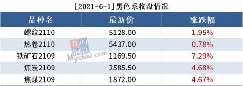 截至6月1日收盘,螺纹2110收5128,涨1.95%;热卷2110收5437,涨0.78%;铁矿石2109收1169.5,涨7.29%。